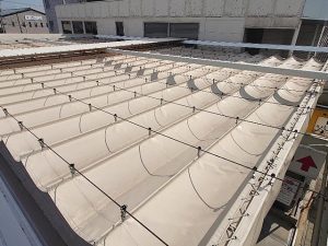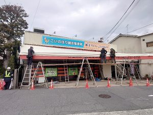 老朽化に伴い、テント修繕工事を行わせていただきました。 道幅の狭い場所での作業となる為、警備員を配置し、安全に作業を行いました。 既存の看板を残しつつ天井部分を張替えさせていただきました。 間口は広いですが、計画を立てて […]